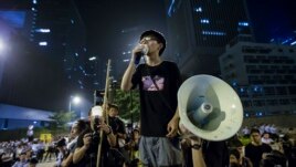 | Joshua Wong, lãnh đạo phong trào sinh viên phát biểu bên ngoài văn phòng của Trưởng quan Hành chánh Hong Kong Lương Chấn Anh. |